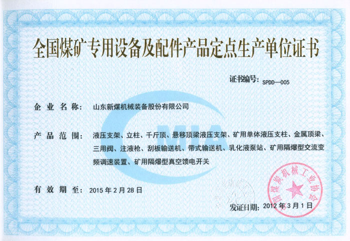 全國(guó)煤礦專用設(shè)備及配件產(chǎn)品定點(diǎn)生產(chǎn)單位證書